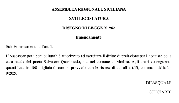 “Apprendo con soddisfazione che il Governo regionale ha deliberato l’acquisizione della casa natale del premio Nobel Salvatore Quasimodo a Modica. La questione era stata sollevata dal sottoscritto e dal Partito Democratico già lo scorso 3 marzo, quando in Commissione Bilancio era stato presentato un sub emendamento a proposito, e più volte ho chiesto di sapere a che punto fosse la procedura per l’acquisizione. Spero che l’iter possa concludersi il prima possibile”. Lo dichiara l’on. Nello Dipasquale, parlamentare regionale del Partito Democratico, componente della Commissione Cultura dell’ARS.