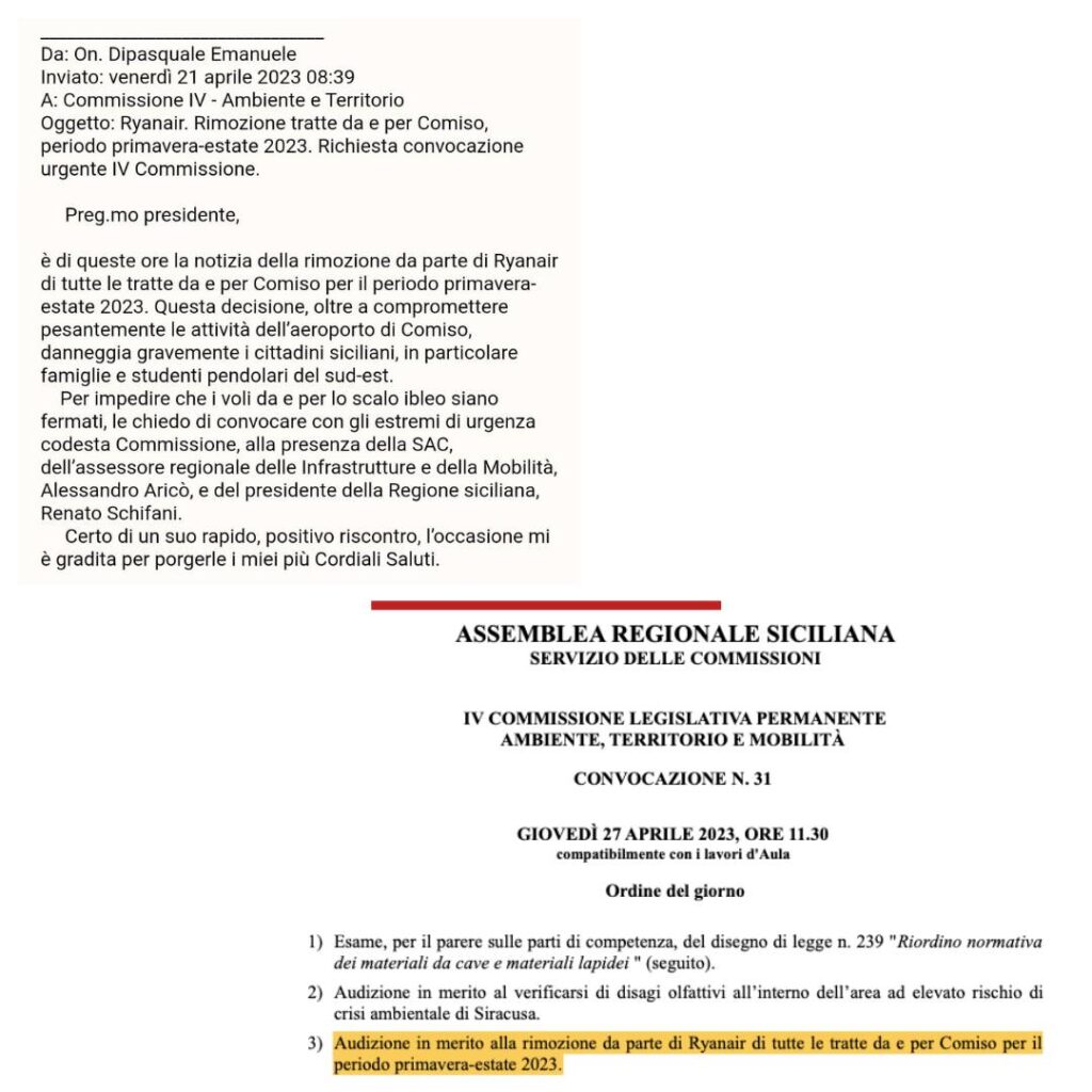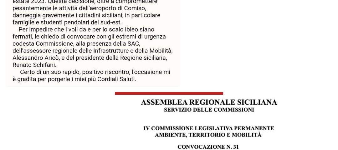 Su mia richiesta di questa mattina, è stata inserita d’urgenza nella prossima seduta della Commissione Ambiente Territorio e Mobilità del Parlamento siciliano l’audizione in merito alla rimozione da parte di Ryanair di tutte le tratte da e per Comiso per il periodo primavera-estate 2023. La seduta è programmata per il 27 aprile e saranno presenti l’assessore regionale alle Infrastrutture Alessandro Aricò, l’arch. Salvatore Lizzio, dirigente generale del dipartimento regionale delle Infrastrutture, e la dott.ssa Giovanna Candura, presidente del consiglio di amministrazione di SAC.