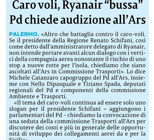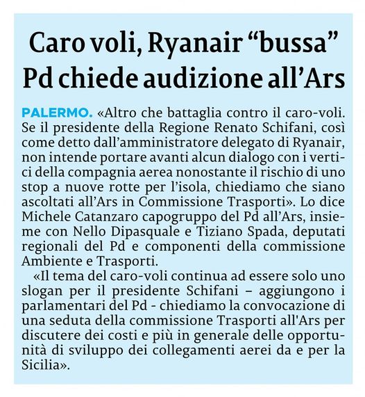 Visto che Schifani non intende avviare un dialogo con Ryanair, noi del Partito Democratico abbiamo chiesto di poter ascoltare la compagnia in Commissione Trasporti ARS.