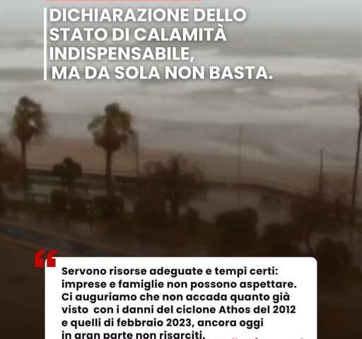 “Non riteniamo sufficiente – aggiunge – una semplice dichiarazione di calamità se non si apre immediatamente un confronto con la Presidenza del Consiglio dei Ministri, così come fece Bonaccini per l’Emilia-Romagna, per ottenere risorse adeguate e tempi certi. Ci auguriamo che questa – conclude Dipasquale – non sia l’ennesima promessa disattesa e che arrivino finalmente risposte concrete alle imprese e alle famiglie duramente colpite da quanto accaduto“.