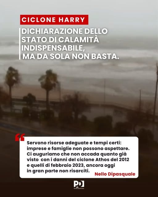 “Visti i copiosi danni causati dal ciclone Harry, che ha colpito la Sicilia, ci aspettiamo – e lo diamo ormai quasi per scontato – la dichiarazione dello stato di calamità naturale. Al tempo stesso, ci auguriamo però che non accada quanto già visto in passato, con i danni del ciclone Athos del 2012 e quelli di febbraio 2023, ancora oggi in gran parte non risarciti”, lo dichiara il deputato del Pd all’Ars Nello Dipasquale.