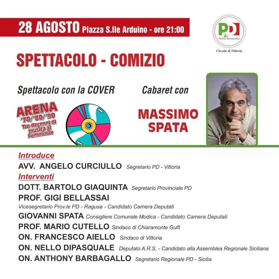 Vi aspetto stasera, sempre a Scoglitti, alle 21 in piazza sorelle Arduino, per il comizio del nostro segretario regionale Anthony Barbagallo al quale seguirà lo spettacolo di cabaret di Massimo Spata.