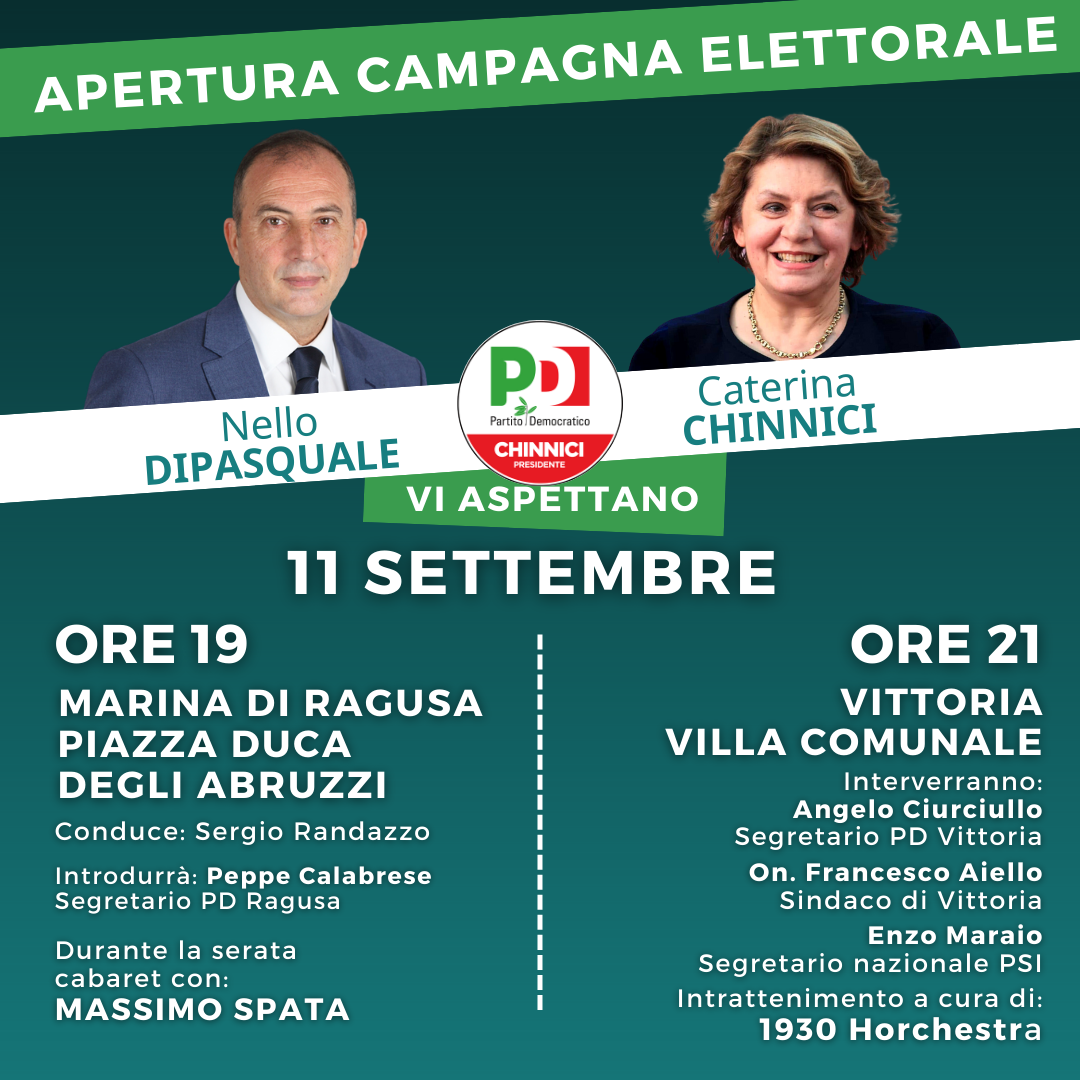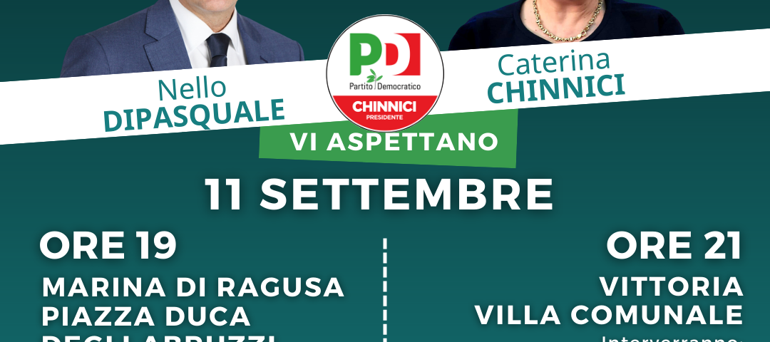 Domenica 11 settembre, si terranno due appuntamenti con Nello Dipasquale e Caterina Chinnici in provincia di Ragusa: alle 19 in piazza Duca degli Abruzzi a Marina di Ragusa festa di apertura della campagna elettorale dell’on. Nello Dipasquale, candidato per il Partito Democratico all’Assemblea Regionale Siciliana. Interverrà alla manifestazione il candidato alla Presidenza della Regione Siciliana on. Caterina Chinnici. Introdurrà il segretario cittadino del PD, Peppe Calabrese, candidato nel listino del presidente. La serata proseguirà con il cabarettista ragusano Massimo Spata.