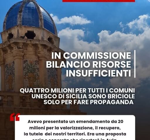 “Prendo atto che la Commissione Bilancio, per i Comuni UNESCO ha previsto uno stanziamento che definire insufficiente è un eufemismo. Quattro milioni di euro, spalmati su tutti i siti siciliani riconosciuti dall’UNESCO e sui geoparchi, rappresentano una cifra che non permetterà di realizzare né interventi strutturali né adeguati piani di valorizzazione. È evidente che, con queste risorse, si potrà fare poco o nulla”. Lo dichiara l’on. Nello Dipasquale, deputato regionale del Partito Democratico all’ARS.