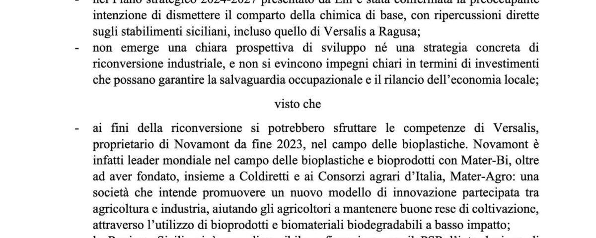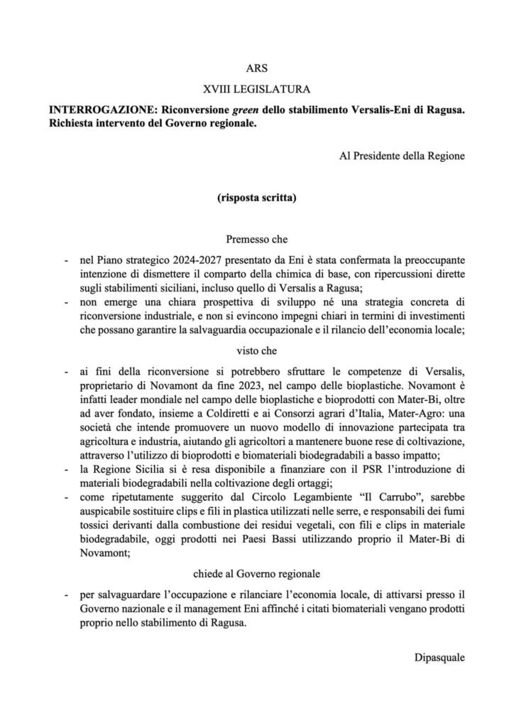 Con una interrogazione al Presidente della Regione e raccogliendo la proposta del Circolo Il Carrubo di Legambiente, ho chiesto un intervento presso il Governo nazionale e il management Eni perché lo stabilimento Versalis di Ragusa possa vedere una riconversione green nella produzione di bioplastiche da utilizzare nella serricoltura.