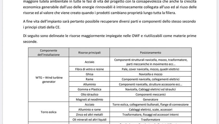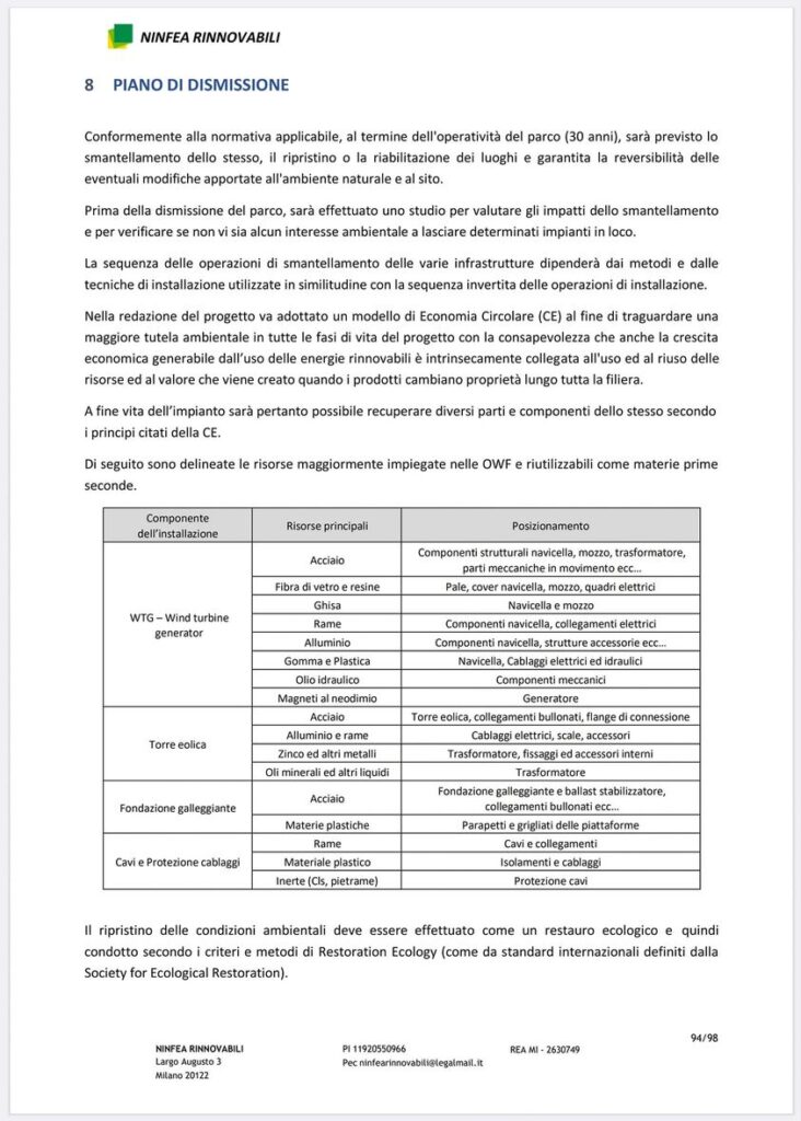 https://www.guardiacostiera.gov.it/…/Rel.01-Relazione… – solo a pagina 94 si parla di dismissione degli impianti. Una paginetta, quindi, che spiega da quante parti è formato un palo eolico, ma non si fa alcun cenno ad eventuali clausule fideiussorie che garantiscono la rimozione degli impianti.
