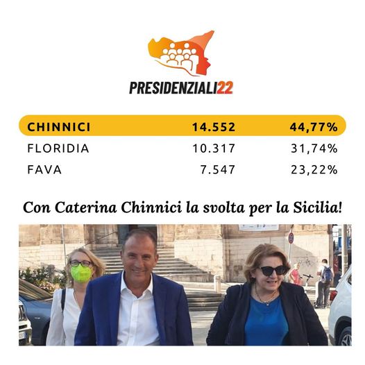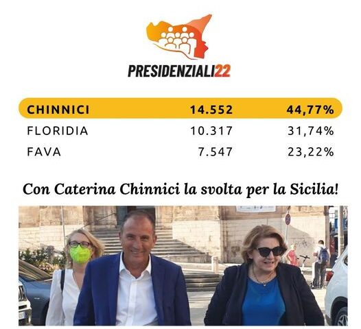 “L’on. Caterina Chinnici ha vinto le primarie di campo progressista e sarà quindi il candidato di coalizione che concorrerà alla carica dii Presidente della Regione Siciliana. È un risultato che scaturisce dalla forza della candidatura dell’on. Chinnici e dall’organizzazione capillare del Partito Democratico siciliano che è riuscito a farsi valere anche su un terreno nuovo, quello del voto online, sul quale non si era mai confrontato. Tutti insieme, adesso, abbiamo l’opportunità di portare il cambiamento nella nostra isola. Da domani torneremo a lavorare per sostenere l’on. Chinnici fino a Palazzo d’Orleans per un nuovo corso della storia di Sicilia”. Così l’on. Nello Dipasquale, parlamentare regionale del Partito Democratico, commenta a caldo i risultati delle Presidenziali 22, primarie del campo progressista in sicilia, che hanno visto le candidature dell’on. Claudio Fava, della sen. Barbara Floridia e del parlamentare europeo on. Caterina Chinnici che ha vinto con il 44,77% e 14552 voti su 32505 votanti.
