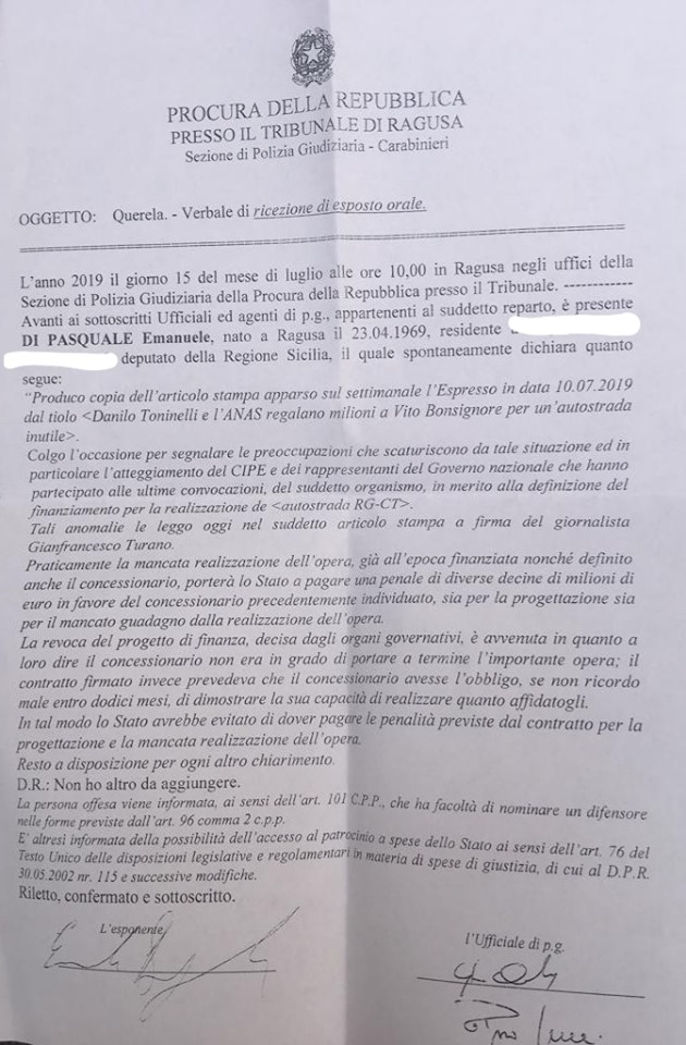 “Lo avevo anticipato esattamente due mesi fa ed oggi, non essendoci novità sul futuro della Ragusa-Catania, ho provveduto a presentare una denuncia alla Procura della Repubblica di Ragusa per segnalare come la mancata realizzazione dell’opera da parte del concessionario porterà lo Stato a pagare decine di milioni di euro allo stesso per risarcirlo del mancato guadagno e dei costi del progetto già approvato e finanziato”. Lo annuncia l’on. Nello Dipasquale, parlamentare regionale del PD, che aggiunge: “Ritengo la mia un’azione doverosa, non solo per il colpevole atteggiamento del Governo nazionale, ma anche alla luce del recente articolo pubblicato sul settimanale L’Espresso nel quale viene ripreso ciò che il sottoscritto denuncia da mesi: se l’autostrada Ragusa-Catania non si farà, l’unico a beneficiare di tale scelta sarà il concessionario che, comunque, incasserà decine e decine di milioni di euro di risarcimenti per il mancato guadagno e spese di progettazione.