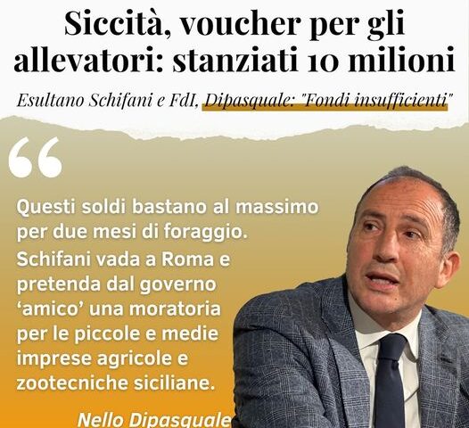 Schifani vada a Roma e pretenda dal governo ‘amico’ una moratoria per le piccole e medie imprese agricole e zootecniche siciliane, altrimenti tutti i suoi buoni propositi resteranno soltanto parole.