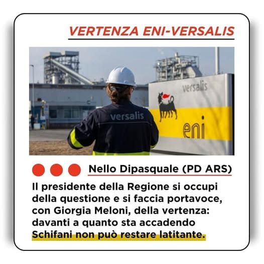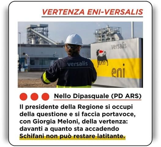 “Una vertenza importante come quella che riguarda Eni e la riconversione dello stabilimento a Ragusa, che vede coinvolte centinaia e centinaia di famiglie, non può essere sottovalutata dalla Regione e dal presidente Schifani che non partecipa ai tavoli convocati dal Mimit non dando supporto e non battendosi per chi vede incertezze sul proprio futuro”. A dichiararlo è il deputato del Pd all’Ars Nello Dipasquale riferendosi al tavolo convocato ieri dal Ministero delle imprese e del Made in Italy a Roma per discutere della chiusura annunciata dello stabilimento di Versalis Eni di Ragusa il 31 dicembre. “Il 31 dicembre, se non si troverà la soluzione, questi lavoratori si ritroveranno in mezzo ad una strada. Chiedo che il presidente della Regione si occupi della questione e che si faccia portavoce, con Giorgia Meloni, di questa vertenza, non possiamo assistere a tutto questo senza che nulla venga fatto e Schifani, davanti a tutto questo, non può essere latitante”