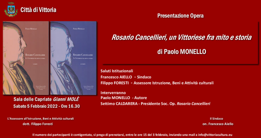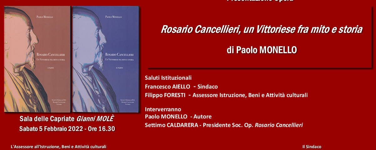 Ho partecipato oggi pomeriggio a Vittoria, presso la Sala delle Capriate Gianni Molè, alla presentazione dei due volumi di Paolo Monello dal titolo “Rosario Cancellieri, un Vittoriese fra mito e storia”.