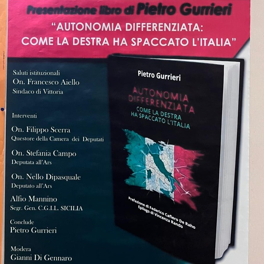 Oggi pomeriggio a Vittoria, alla presenza del sindaco Aiello e di altri autorevoli relatori tra i quali Alfio Mannino, Segretario regionale CGIL Sicilia, si è tenuta la presentazione del libro di Pietro Gurrieri “Autonomia differenziata: come la destra ha spaccato l’Italia”.