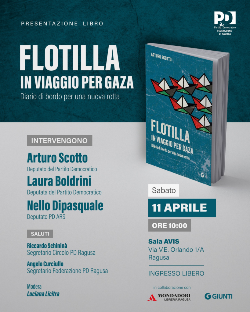 La mattina, alle ore 10, alla Sala AVIS di Ragusa, presenteremo il libro di Arturo Scotto “Flotilla. In viaggio per Gaza”, insieme a Laura Boldrini. Un’occasione preziosa perché prendendo spunto dall’emozionante testimonianza di Scotto a bordo di una delle imbarcazioni dirette a Gaza, rifletteremo insieme su temi fondamentali come i diritti umani, la pace e il ruolo della politica internazionale.