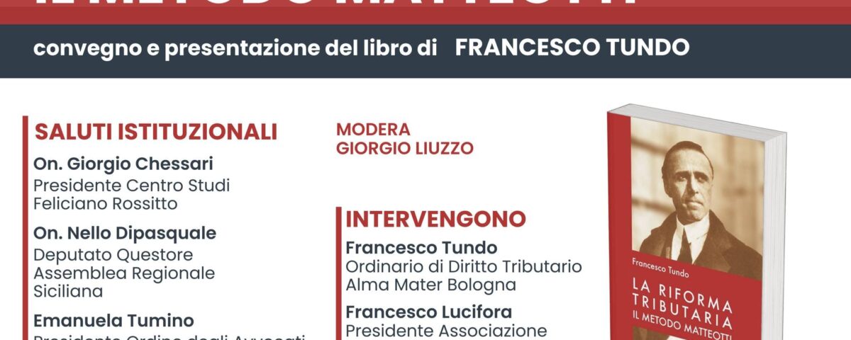 Giovedì 14 novembre, a partire dalle ore 16, presso il Centro Studi Feliciano Rossitto di Ragusa, si terrà la presentazione del volume “La riforma tributaria. Il metodo Matteotti” del prof. Francesco Tundo, ordinario di Diritto Tributario all’Università di Bologna.