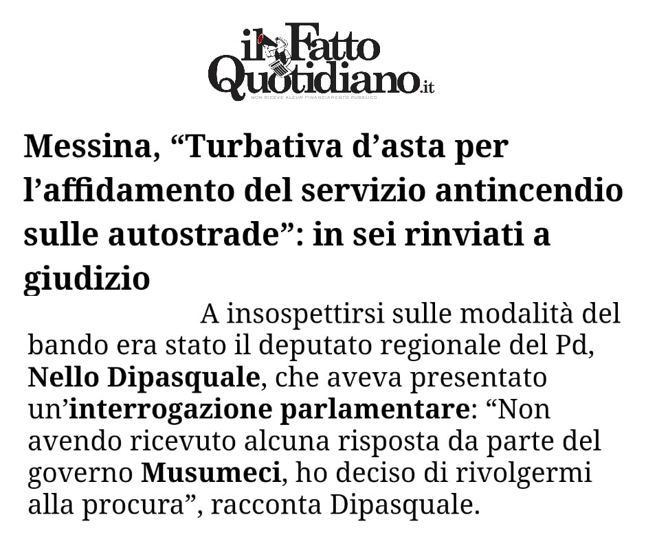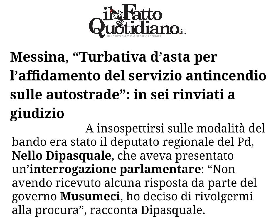 Qui l’articolo del Fatto Quotidiano: https://www.ilfattoquotidiano.it/2023/12/22/messina-turbativa-dasta-per-laffidamento-del-servizio-antincendio-sulle-autostrade-in-sei-rinviati-a-giudizio/7391406/?fbclid=IwAR1RxJTjm9wvtzRz3lzv1M-Ewti5YRaHHNxIjTovwzWsr9ORLEpvFMjGCc8