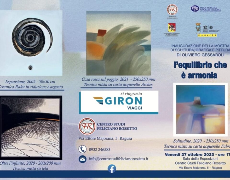 Domani, 27 ottobre, alle ore 17.30, presso la sala esposizioni del Centro Studi Feliciano Rossitto a Ragusa, interverrò alla cerimonia di inaugurazione della mostra di scultura, grafica e pittura “L’equilibrio che è armonia”, di Oliviero Gessaroli.