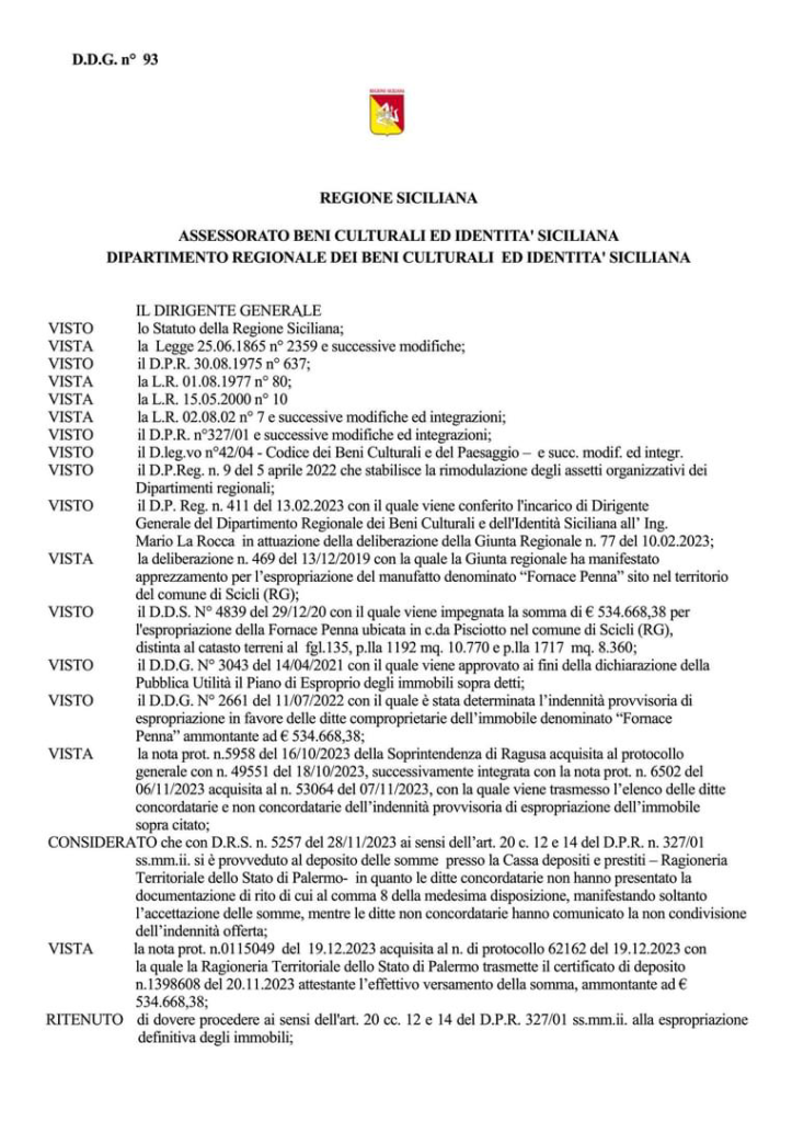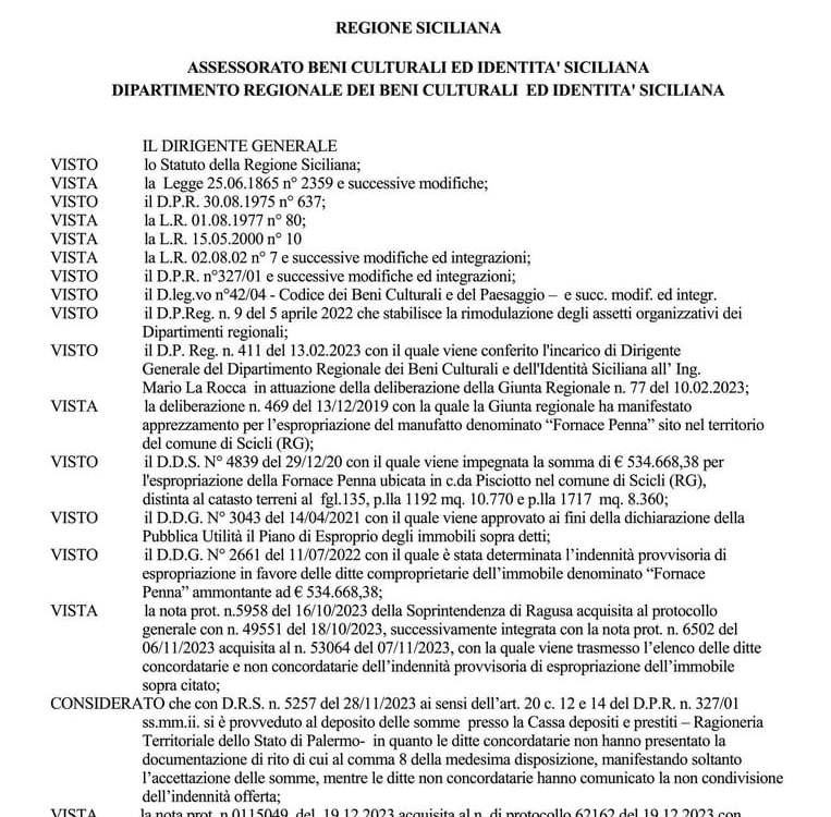 “Dalla direzione generale dell’Assessorato regionale dei Beni Culturali è arrivato il decreto di espropriazione definitiva in favore del demanio regionale degli immobili costituenti la Fornace Penna”. Lo rende noto l’on. Nello Dipasquale, parlamentare regionale del Partito […]