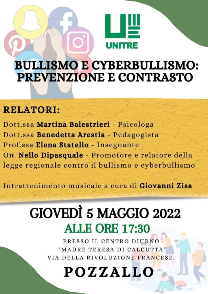 Oggi pomeriggio, a Pozzallo, come promotore e relatore della legge regionale di contrasto ai fenomeni del bullismo e del cyber-bullismo sono intervenuto all’incontro organizzato dall’UniTre di Santa Croce Camerina e dall’UniTre di Pozzallo dal tema, appunto, “Bullismo e Cyber-bullismo: prevenzione e contrasto”.