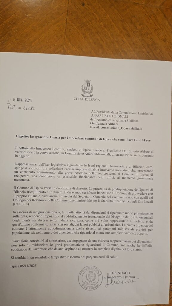 Questa mattina si è riunita la Prima Commissione parlamentare, che ha finalmente ascoltato il Comune di Ispica, con la presenza del sindaco e delle organizzazioni sindacali, sulla grave situazione dei lavoratori che attendono l’integrazione oraria a 35 ore, indispensabile per garantire i servizi essenziali alla città.